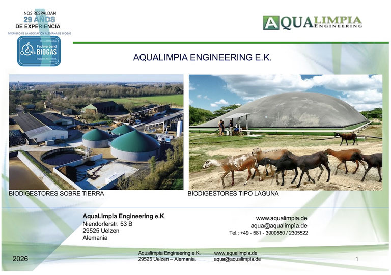 Aqualimpia Engineering e.K. es una empresa alemana de ingeniería integral especializada en el tratamiento y aprovechamiento de residuos y aguas residuales para la producción de energías renovables (biogás, biometano).